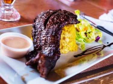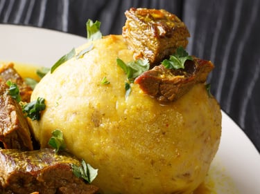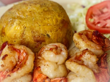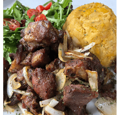 Mofongo is traditionally served with a side of broth or sauce poured over it and pairs beautifully with stewed meats,fried pork, shrimp, or chicken.
