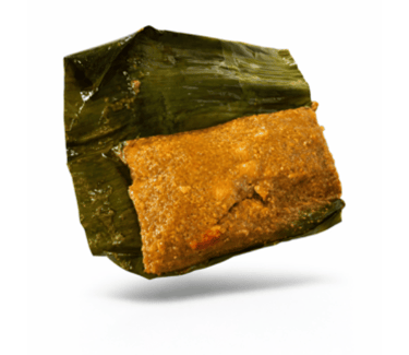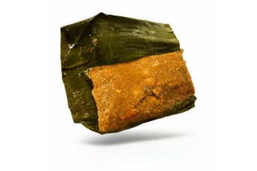 A holiday favorite made from green banana dough filled with seasoned meat and wrapped in banana leaves before cooking.